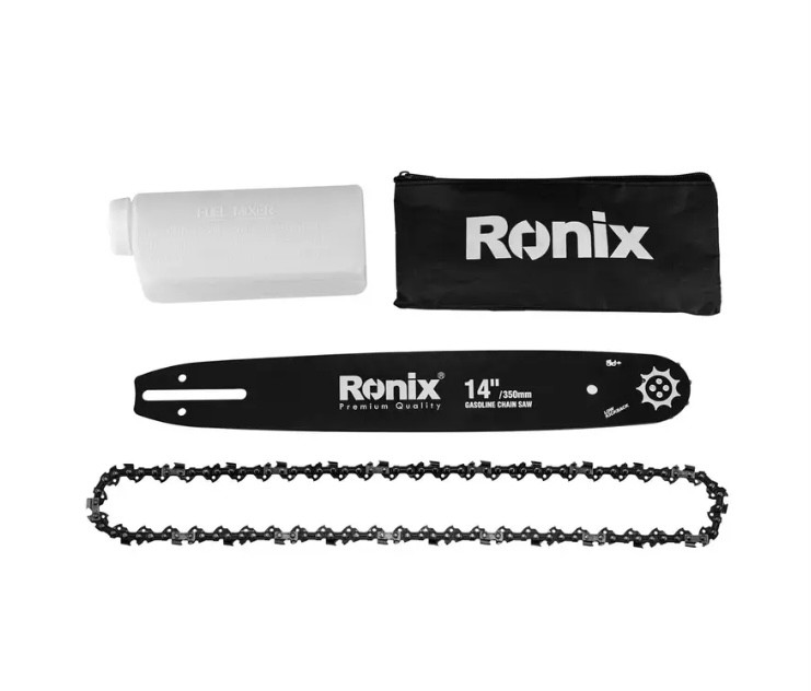 دستگاه در جعبه رنگی رونیکس به همراه زنجیر، ساطور، بطری ترکیب روغن و بنزین، روکش ساطور و کیف ابزار شامل پیچ گوشتی، سوهان، آچار شمع، بوش و دو عدد پیچ به بازار ابزار ایران عرضه میشود.