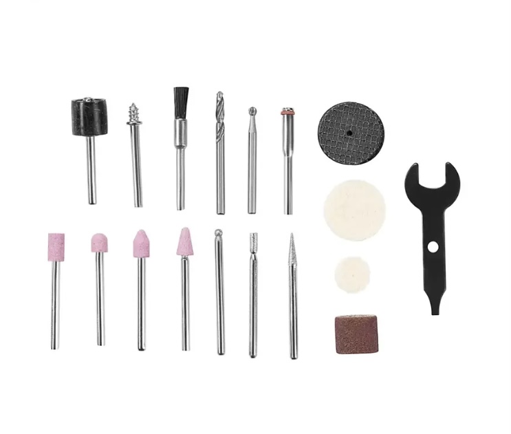 -شامل 26 عدد متعلقات کاربردی مختلف برای سنبادهزنی، برش، صیقلدادن، کندهکاری، پرداخت و تمیز کردن سطوح مختلف چوبی و فلزی