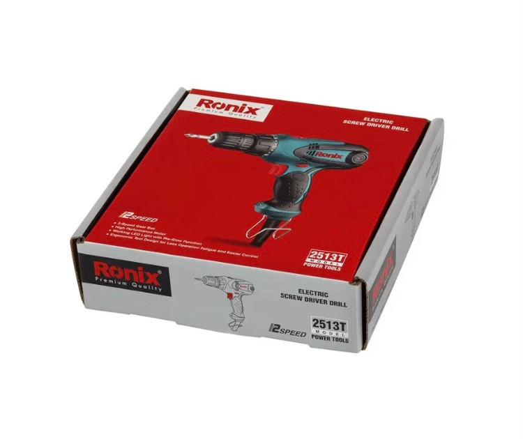 افزونبراین، گیربکس این محصول، تنظیم گشتاورهای مختلف را امکانپذیر میکند. این گیربکس دو سرعته، سرعت گردش مته را در یکی از دو حالت صفر تا 440 دور بر دقیقه یا صفر تا 1650 دور بر دقیقه کنترل میکند. بدنهی ضد ضربهی پیچگوشتی برقی 2513T رونیکس در برابر ضربههای احتمالی، سقوط و برخورد با اشیا، مقاوم است. البته وزن 1,3 کیلوگرمی و طراحی ارگونومیک این پیچگوشتی برقی، آن را به ابزاری خوشدست تبدیل کرده که از بروز چنین سوانحی پیشگیری میکند. گیره اتصال کمری فلزی نیز در این ابزار موجب حمل آسان و امکان استفاده از آن در ارتفاع میشود.