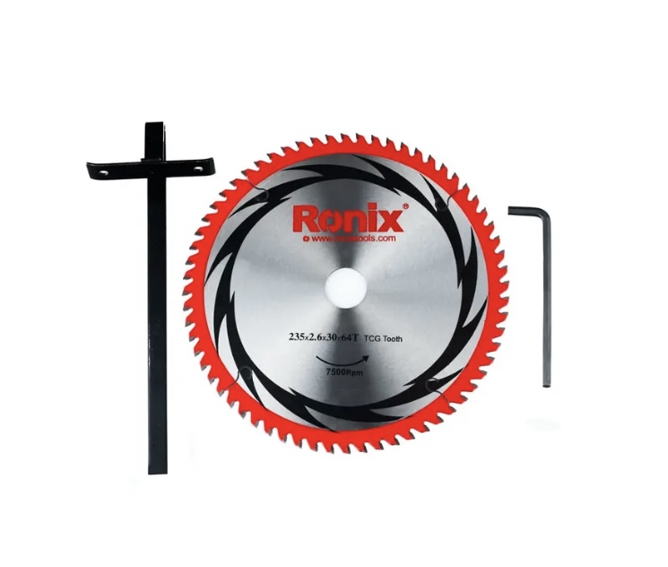 ارائهشده در جعبه رنگی رونیکس همراه با گونیا، دسته جانبی، دو رینگ تیغه، آچار آلن، تیغه 235×2.4×30 میلیمتری 56T