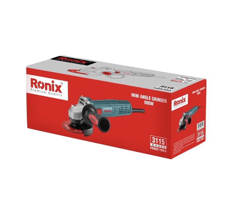 مینی فرز صنعتی 3115 در جعبه رنگی رونیکس و همراه با متعلقاتی مانند کاور صفحه برش، دستگیره کمکی، آچار و یک جفت ذغال به بازار ابزار ایران عرضه میشود.